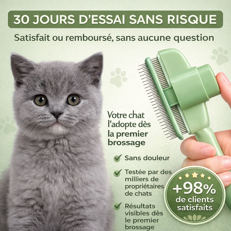 Votre chat va adorer chaque brossage Grâce à ses picots délicats, la Brosse Féline glisse facilement dans le pelage de votre chat sans tirer ni accrocher. Moins de poils partout, plus de moments de complicité . Votre chat est plus propre, plus détendu… et vous profitez d’un intérieur impeccable. Essayez-la sans aucun risque pendant 30 jours . Satisfait ou remboursé, simplement.